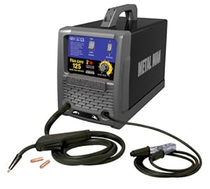 METAL MAN FC125 115 volt input, 125 amp AC output flux core only wire feed welders is economical and easy to use. It requires no shielding gas and welds 8 gauge to 3/16" mild steel materials with .030" or .035" flux core wires on 4" or 8" spools. Features 2 voltage ranges, set up chart, cooling fan, trigger activated arc, overload protection, 6 ft MIG gun with Tweco style series 11 replacement parts and 6 ft ground cable and clamp. 27V no load voltage, 60-125 amps output, 20% duty cycle @ 80A, overall dimensions=17.7" X 9.3" X 14.3" and weights about 38 lbs. Includes extra contact tips and 8" spool adaptor. Toll free welder help line at 888-762-4045, 1 year liminted warranty.